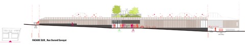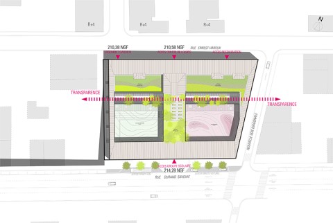 La différence de niveau entre les deux rues permet d’imaginer un fonctionnement sur deux niveaux qui peuvent s’ouvrir de plain-pied sur chacune des deux rues. Le parti urbain devient alors très clair : le bâtiment se décompose en deux strates : un socle minéral en béton lasuré sombre, percé de larges baies dévoilant l’intérieur de l’ilot, et une couronne en structure bois constituée de panneaux verticaux en bois sur un rythme régulier alternant des parties vitrées, des parties protégées de la vue ou du soleil par des brises soleil et des parties pleines.