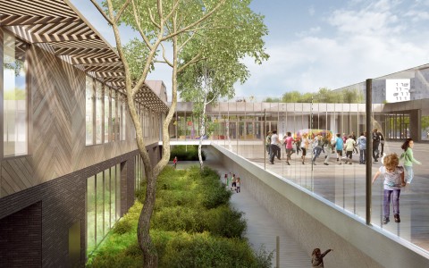 Le Groupe Scolaire Durand-Savoyat est le premier élément architectural programmé sur le secteur. Il s’inscrit cependant de façon plus large dans un territoire en profonde mutation et qui concerne l’intégralité de la Presqu’ile de Grenoble. Nous prenons le parti de proposer un projet qui s’installe dans son site de la façon la plus pertinente possible du fait de son usage. Notre projet s’adresse prioritairement à la rue Durand Savoyat du fait de la position de son entrée groupée, située au milieu de la façade en alignement sur rue.