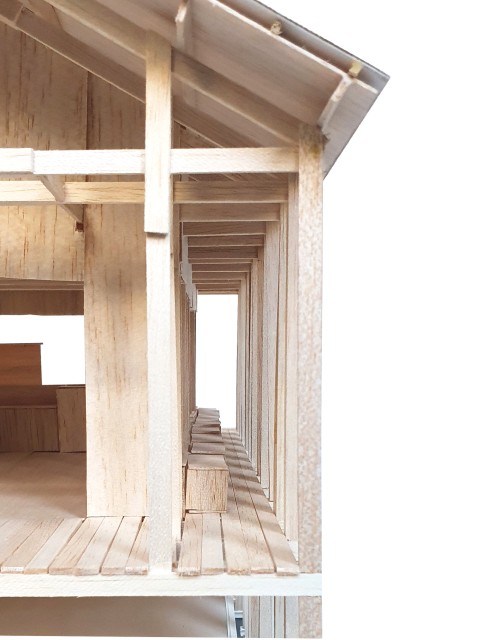 On a commencé par construire des établis qui nous ont permis de produire nous-mêmes toutes les pièces de bois nécessaires à l’ouvrage.