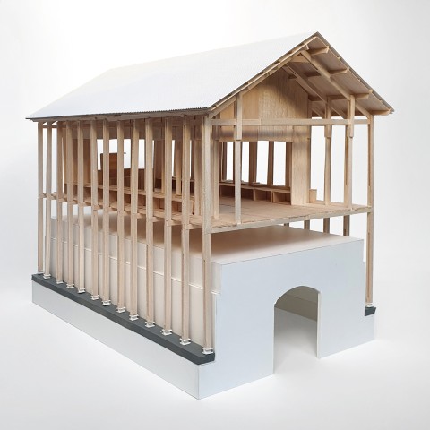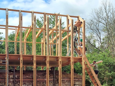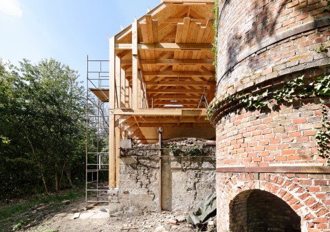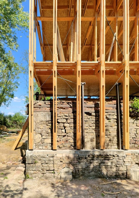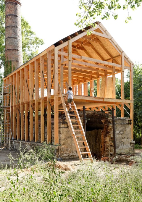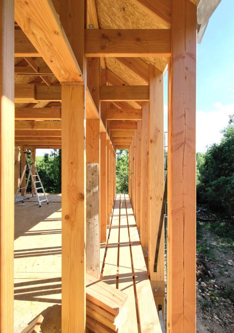 L’idée étant d’enchâsser l’ancien four à brique pour construire au-dessus, tout en bois : 500 planches de Douglas, toutes de section égale (2800 x 200 x 45), livrées sur site, déchargées à la main.