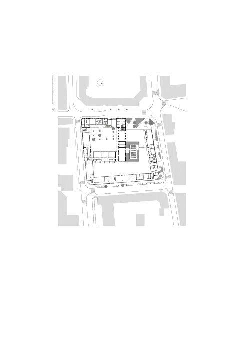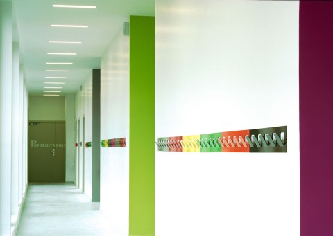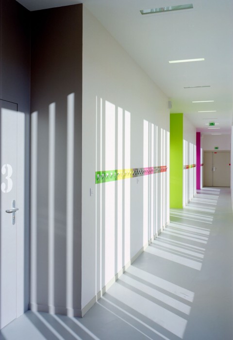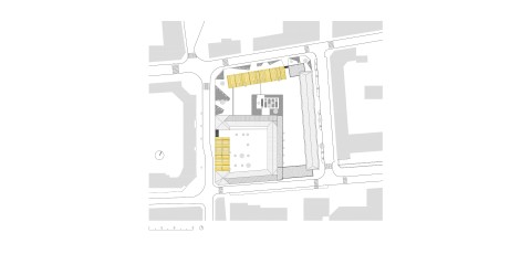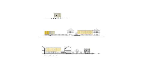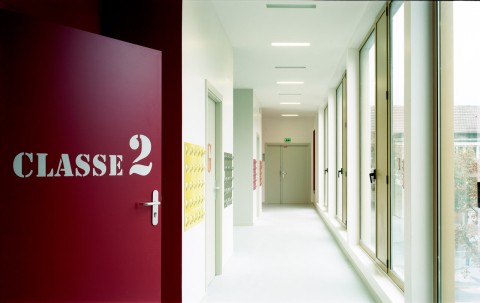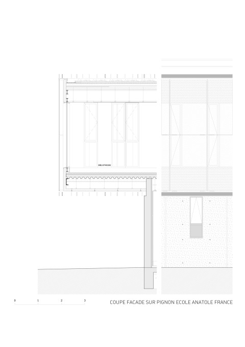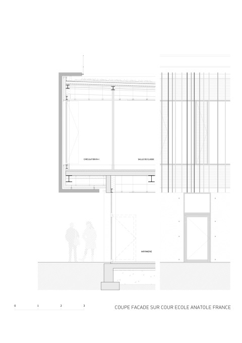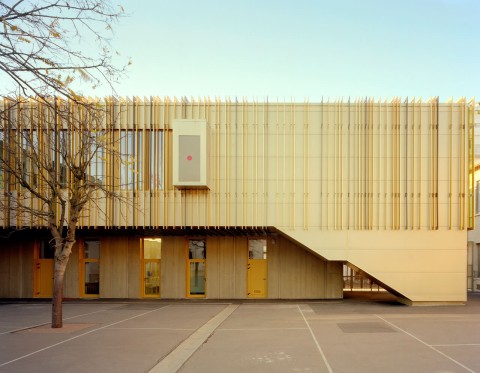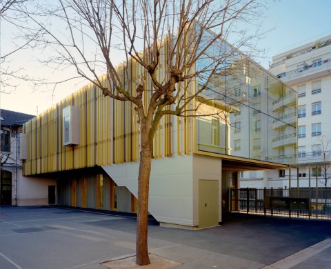 The purpose of the competition was to build together on a residual urban plot an extension for each of the two schools located in a residential district of Courbevoie. We suggested to build each extension in keeping with the existing buildings, freeing ourselves from the masterplan drawn by the city council. Our project is made of two schools with two twin extensions gathering around a single playground. Both building have the same cladding material, thus creating a sense of unity in this heterogeneous neighborhood. A stained self-consolidating concrete base houses the ground floor, encloses the playground and bears two other metallic volumes. The façades of the raised volumes are cladded with a pattern of vertical elements made of anodized aluminum with champagne, bronze and gold colors.