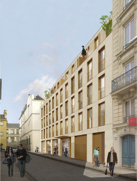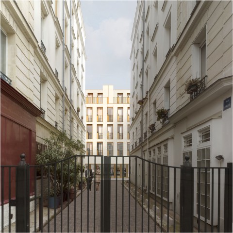 C’est un hôtel 5 étoiles qui vient se glisser entre rue, cour et passage. Imbrication subtile et complexe, l’hôtel est la résultante ordonnée de ce chaos urbain. Il s’insère tout de pierre vêtu et s’agrémente de touches de bronze. Il redessine la cour jardin de l’hôtel particulier lui faisant face en se reculant largement pour compléter la composition première. Il se creuse pour laisser respirer les voisins ici et là, et reprend le fond de passage anonyme et symétrique. Il est tout en retenue dans son dessin même ; en tenue aussi, par les quelques détails soulignant les ouvertures, les gardes corps ou les accès.