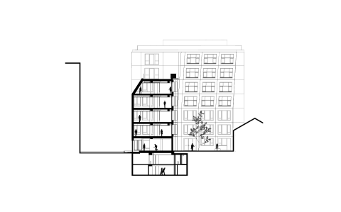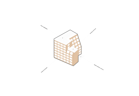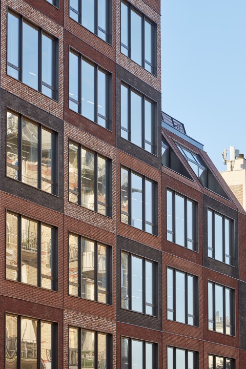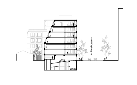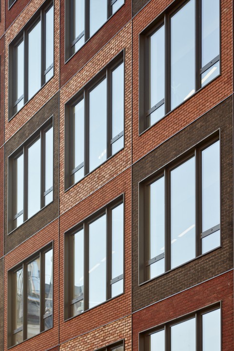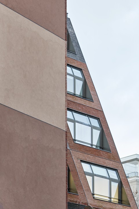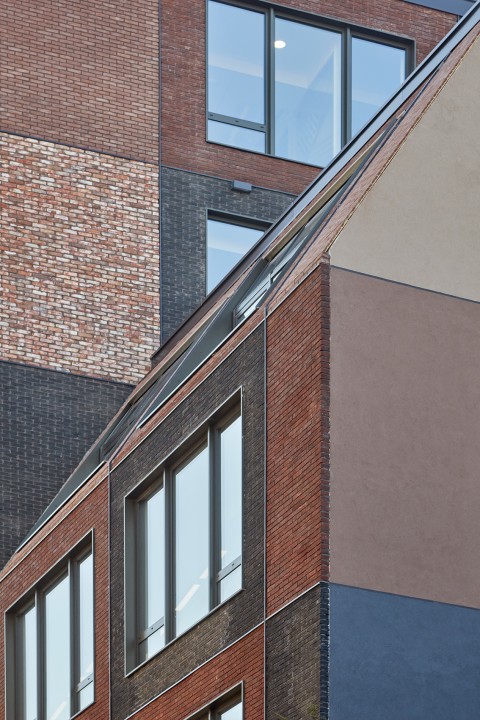 Ce monolithe très compact de brique vêtu est défini par les contraintes réglementaire et réglé par une trame anonyme parfaitement calepinée.
