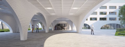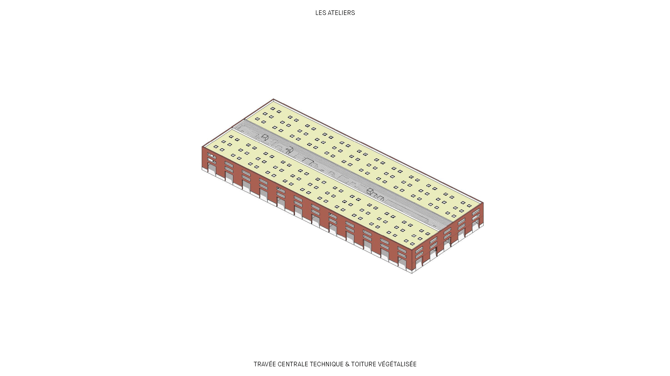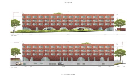 Nous avons privilégié des larges percements réguliers horizontaux entre trame porteuse avec allège pleine. La brique formant vêture de protection de l’isolation extérieure constitue la peau des bâtiments. Nous nous inscrivons dans une démarche environnementale innovante et respectueuse de l’histoire des matériaux. Nous proposons alors d’utiliser des briques de réemploi. Nous proposons, dans la mesure où les teintes seront nécessairement hétérogènes en fonction des ressources disponibles au moment de la construction, de mettre en œuvre ces briques selon un mode souple de gradation des teintes : du plus foncé au plus clair, du bas vers le haut, dans un souci d’allégement des masses bâties. Sombre en pied de bâtiment pour son rapport au sol, clair en rive pour son rapport au ciel.