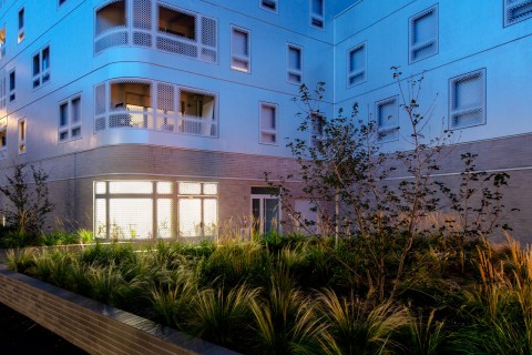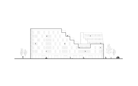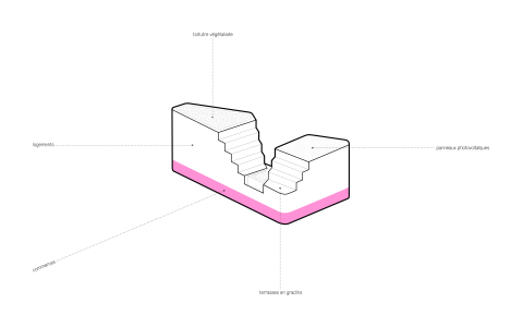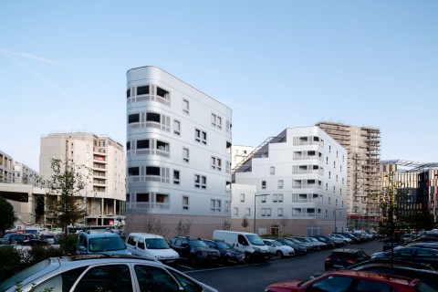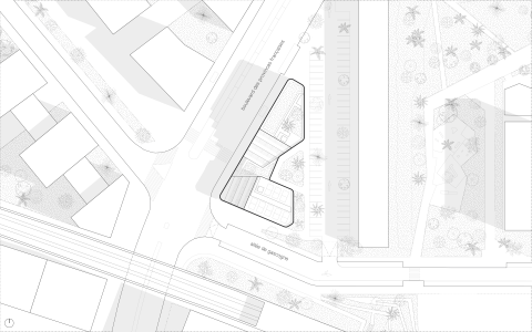 The A1 plot is located in a very singular urban area, at the fringe of the ZAC des Provinces Françaises grid plan. It must be looked as a “triangular isle” with three faces conversing with their close surroundings. The six-storey building acts as a figurehead in the neighborhood and creates a significant visual landmark in the wider landscape. The chamfer angles emphasize the kinetic effect created by the delicate shape of the building, guiding us towards the boulevard, or inside the plot. All of the 43 apartments have an outdoor space, either a loggia or a terrace covered with a pergola.