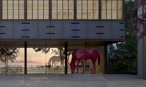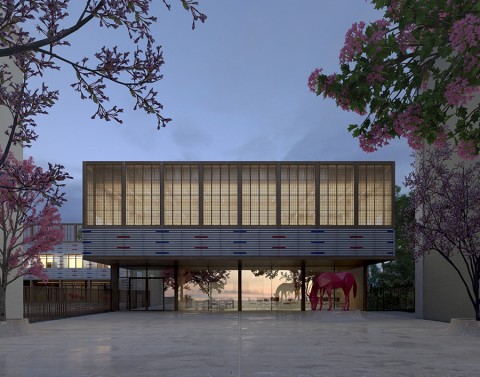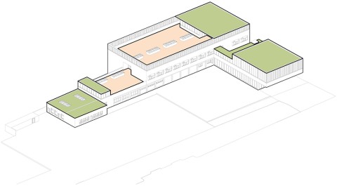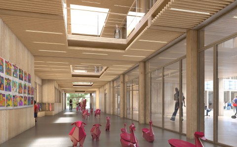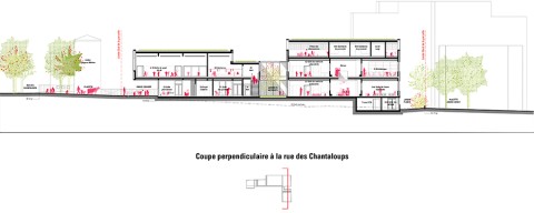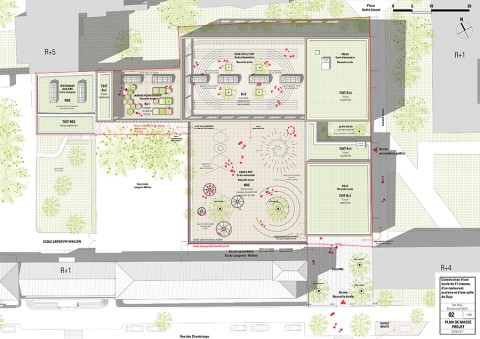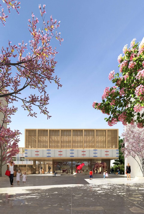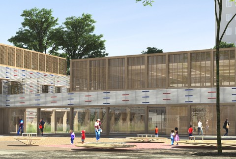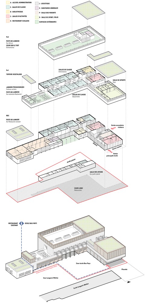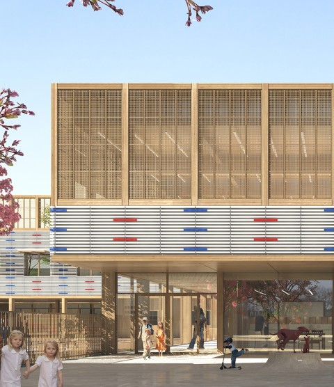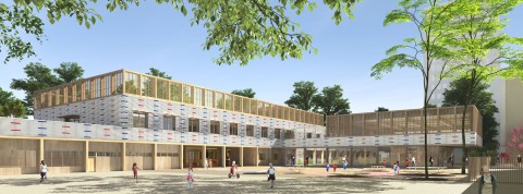 Le nouveau groupe scolaire se présente sous la forme d’une équerre orientée sud-ouest, composée d’un corps principal est-ouest, sur deux niveaux, installé en fond de parcelle. Le bâtiment s’inscrit dans le paysage de façon très régulière, il ne cherche pas à s’imposer mais au contraire, à trouver sa juste place volumétrique dans une configuration déjà très dense. L’école se manifeste depuis l’espace public par une façade frontale reprenant la mesure entre les pignons des deux voisins. Le volume du dojo en porte-à-faux fait face aux usagers, leur offrant un espace couvert et protecteur avant de pénétrer dans l’enceinte de l’école. La relative exiguïté de la parcelle a généré l’idée de proposer, à la fois, des espaces extérieurs en terrasse et sur les toits, mais également un vaste espace intérieur en atrium afin d’offrir de larges espaces de distributions animées par des sculptures d’animaux en mousse acoustique absorbante. Construction intégralement en structure bois CLT, le projet développe une trame rationnelle et évolutive pour permettre une construction d’éléments hors site.