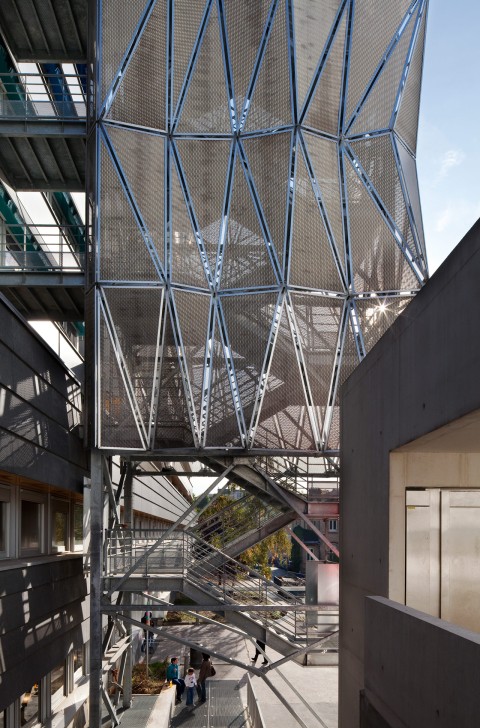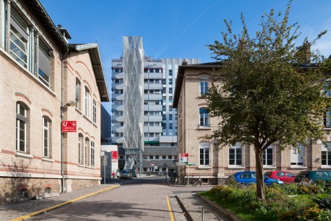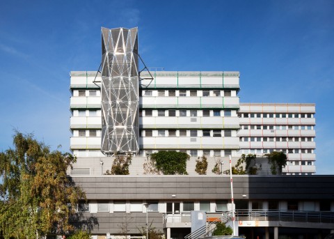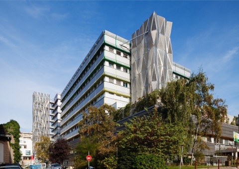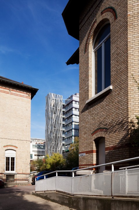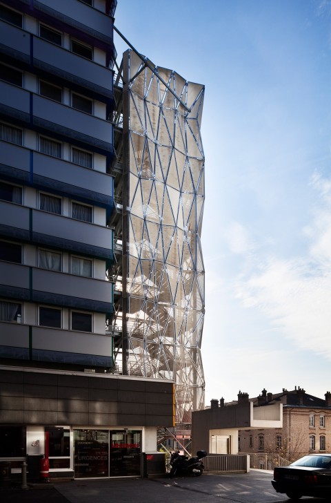 In the context of improvement works of security conditions in the Armand Trousseau hospital (Paul-Louis Chigot building), our project proposal was to create 3 outdoor staircases that would help evacuating people in emergency cases. The staircases are designed like thin and shiny towers hugging this hospital for sick children in a singular way. The metallic and articulated triangular panels are revealed when hit by sunrays. The many surfaces are folded like a sleek piece of paper. The stairs and safety guards can be seen through the almost-transparent cladding.