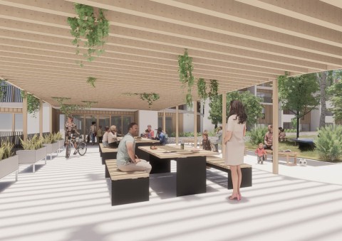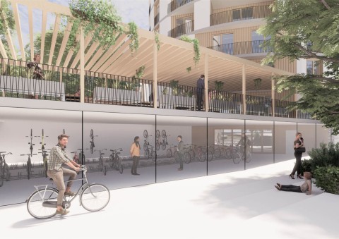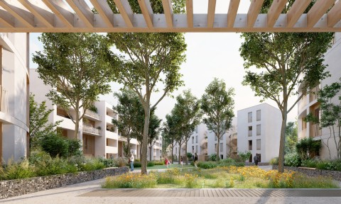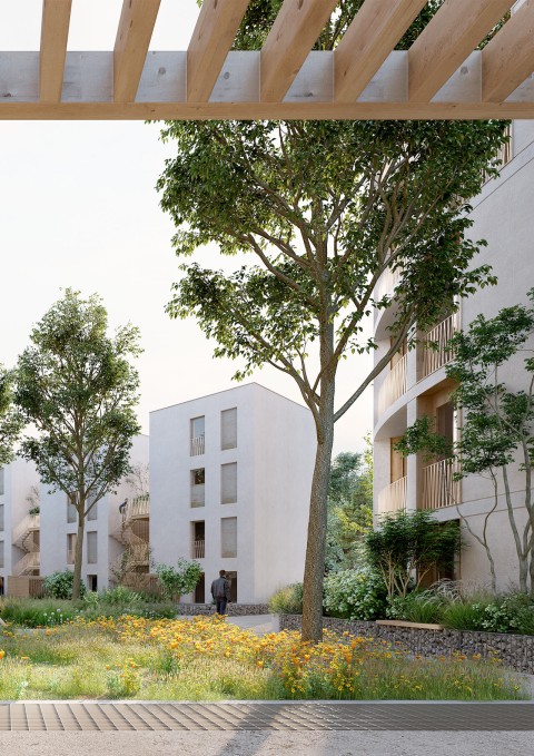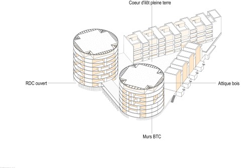 La terre crue, laissée apparente en intérieur, garantit un niveau de confort élevé et participe également à la qualité esthétique des intérieurs. L’emploi de ce matériau biosourcé, qui pourrait même être extrait du site pour fabriquer les blocs, contribue à diminuer le bilan carbone. Afin d’apporter une inertie conséquente et protéger la terre crue des intempéries, les bâtiments seront isolés par l’extérieur par l’intermédiaire de fibre de bois sous bardage rapporté bois ou enduit hygrothermique type chaux/chanvre. Enfin, le dernier niveau des deux bâtiments de logements collectifs (attique) sera composé d’une structure à ossature bois, isolée intrinsèquement par de la fibre de bois ou isolant lin/chanvre/coton.