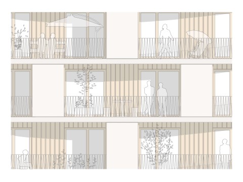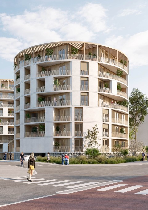 En attique, le plan s’affine et libère des terrasses plein ciel très généreuses, protégées cependant par une pergola qui reprend le thème générique du cercle. Les façades des attiques sont entièrement revêtues de bardage bois à l’image des fonds de loggias.