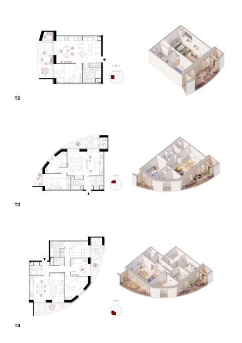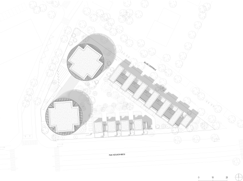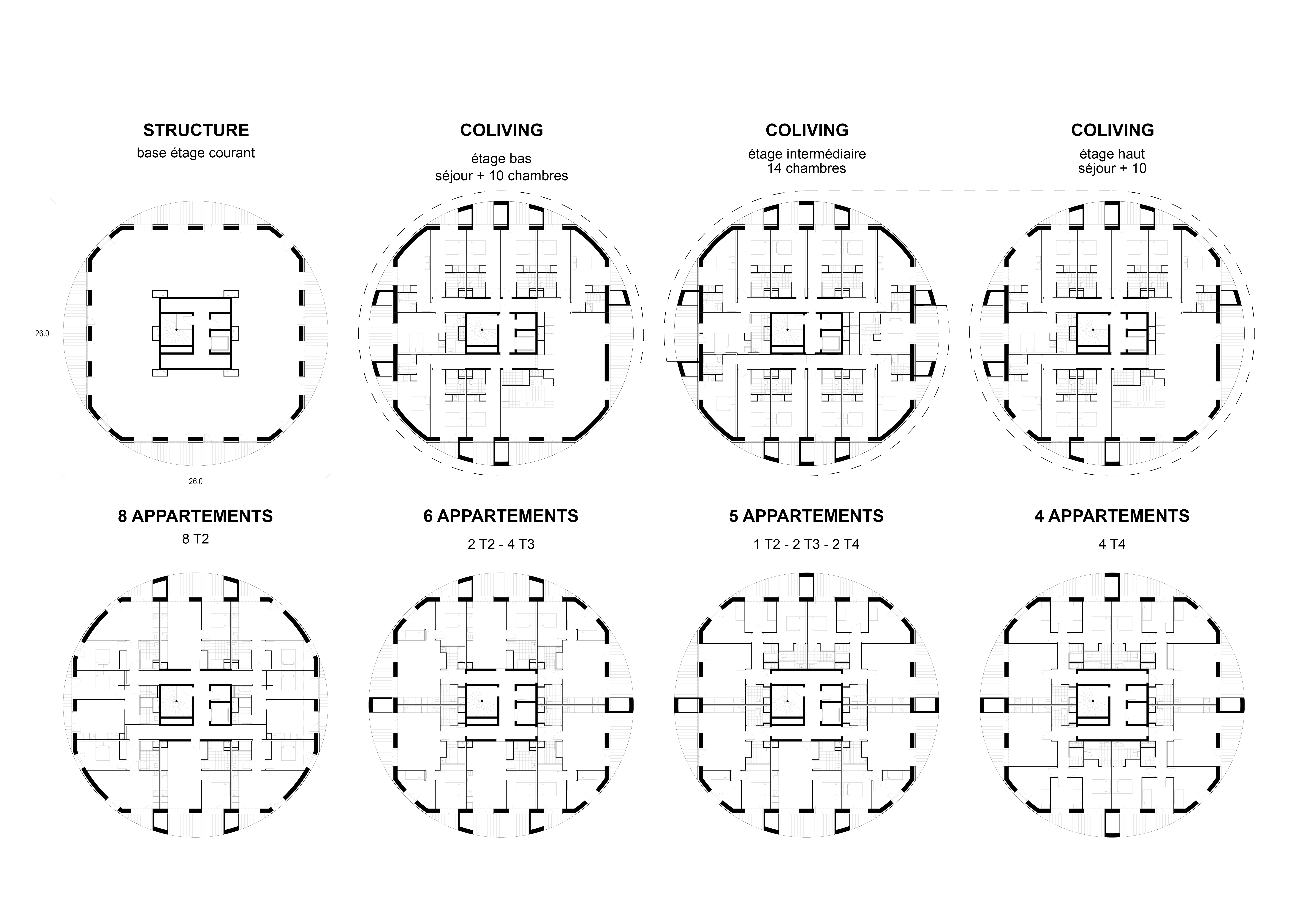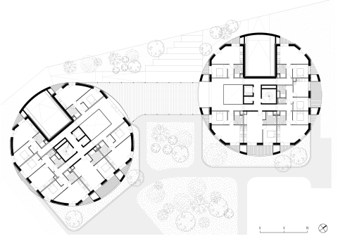 Le principe architectural des plots circulaires permet de réaliser des plots très compacts avec une très grande possibilité de créer des loggias profondes sur la périphérie. Les plots se présentent comme des cylindres creusés par des loggias ; des espaces de rangements sur les terrasses créent la séparation entre appartements.