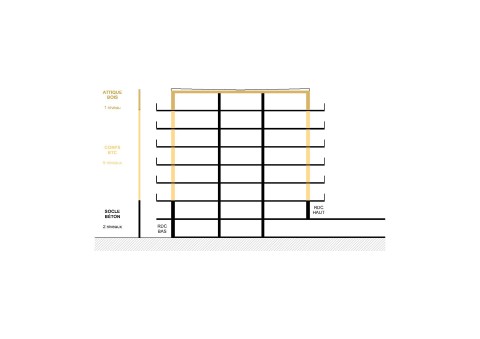 • Un attique pour le dernier niveau : murs porteurs en ossature bois, noyau porteur en béton, couverture en bac acier.