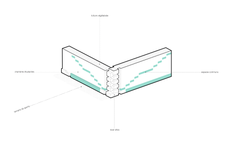 Chaque étage accueille lui aussi un espace commun dédié à la convivialité, permettant aux étudiants de se retrouver et de travailler ensemble. Un espace extérieur, adressé sur la rue Saint Gobain, fait office de cour et offre des usages partagés pour tous les étudiants. Enfin, les toitures végétalisées offrent un espace ouvert à tous, avec une vue dominante sur la ville d’Aubervilliers.