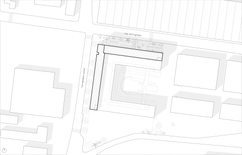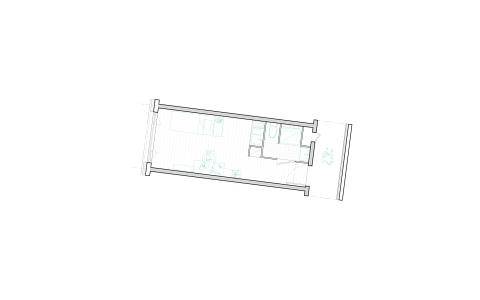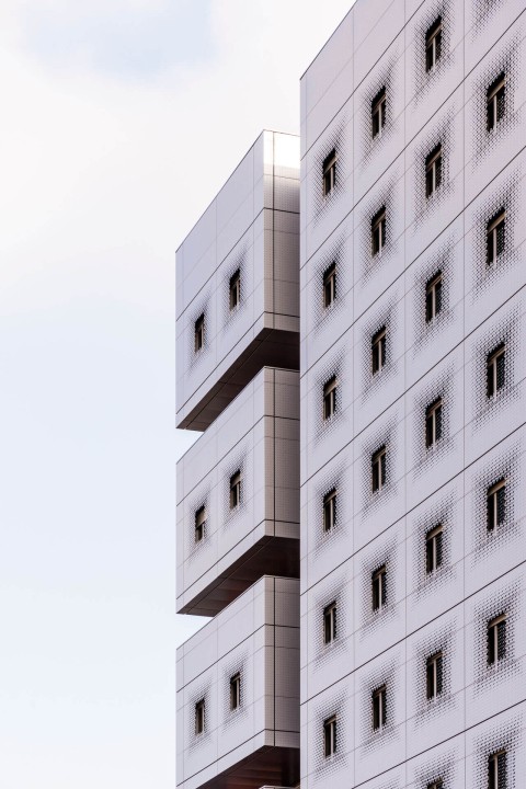 Véritable prise d’angle, le projet est formé de deux résidences siamoises, adossées au mur pignon du CIFA d’une épaisseur de 9,50m chacune. Nous avons pris le parti de jouer la carte de la gémellité façon « doublure recto-verso ». Blanc pour le côté pile, cuivré pour le côté face, le tout en béton lasuré pour le rez-de-chaussée et en vêture métallique perforée pour les façades. Chacun des rez-de-chaussée, prévu pour un usage collectif, héberge des services tels que l’accueil, la cafétéria, l’espace de co-working, la buanderie, les rangements pour vélos, etc.