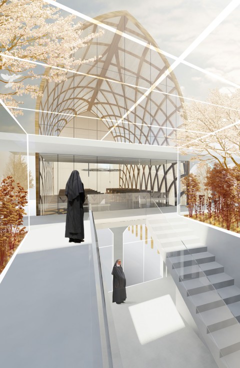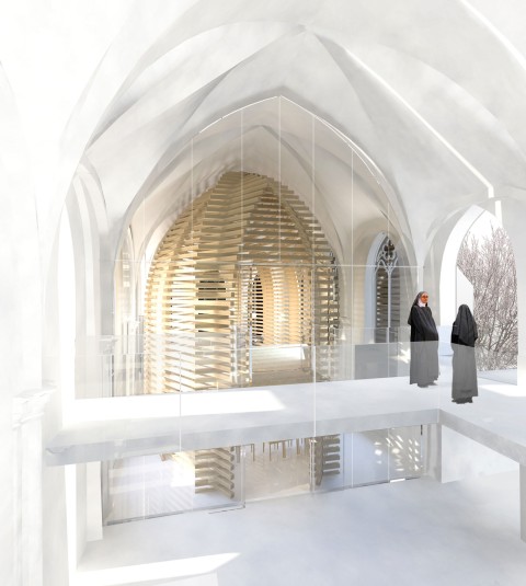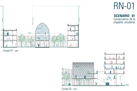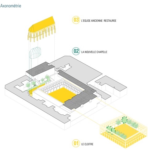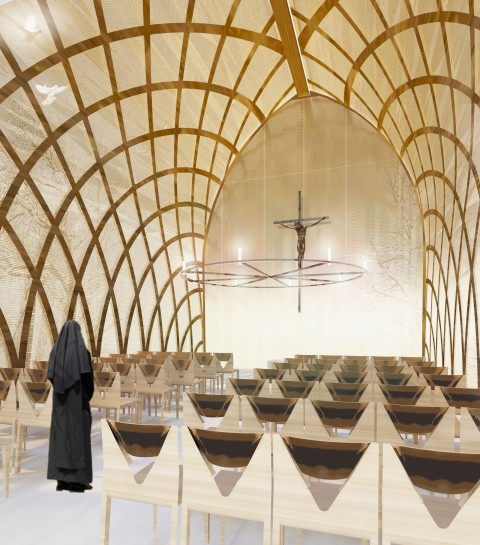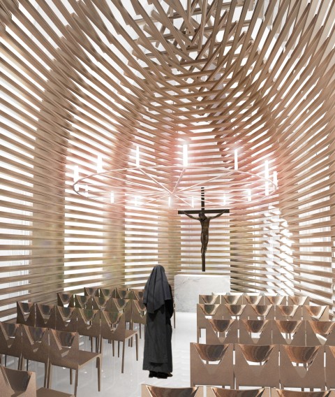 Une chapelle au cœur de l’église. Installée au premier étage dans l’espace du chœur de l’église existante et bénéficiant de la lumière naturelle filtrée des vitraux, l’espace de la chapelle se matérialise à l’intérieur d’une structure réalisée par un savant empilement de tasseaux unitaires en bois. Cette construction constitue un véritable cœur contenu dans l’espace plus large de l’église. Elle vient restituer sous une autre forme l’espace sacré de l’église existante. Une forme plus humble, plus accueillante, plus disponible pour les sœurs. Elle forme un nouvel écrin, à la fois modeste et universel.