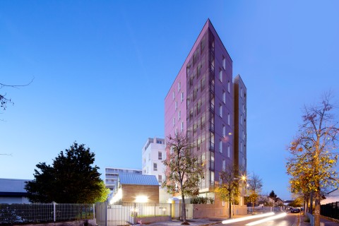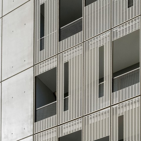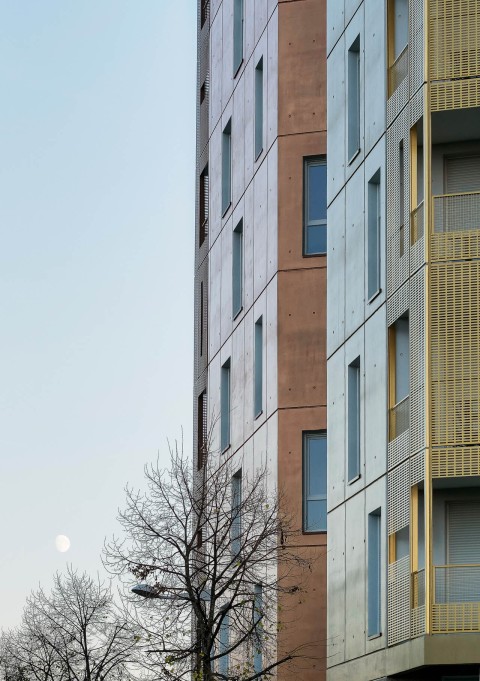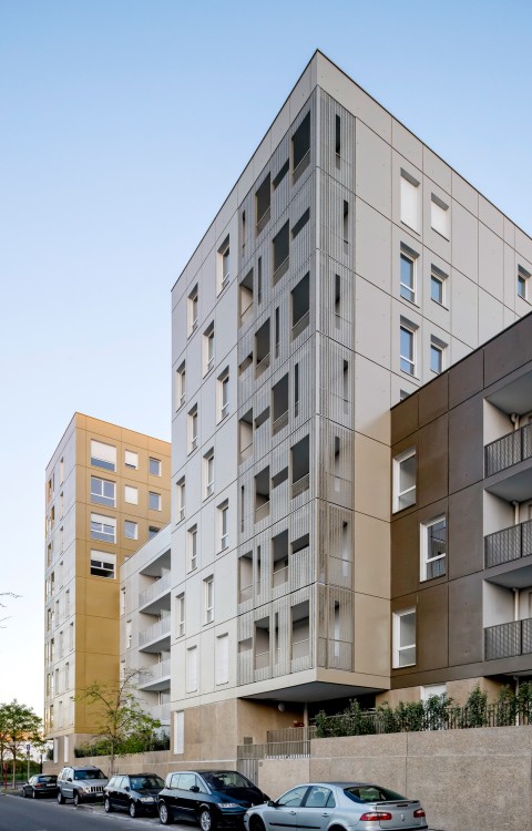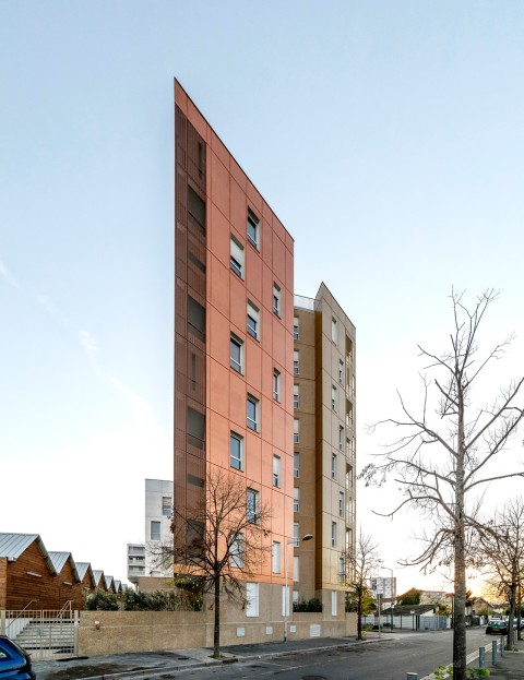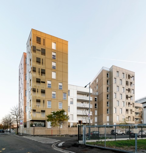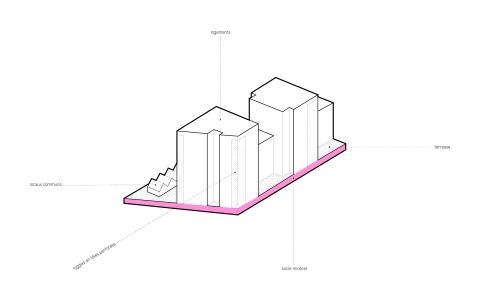 La silhouette découpée de cette opération naît de la juxtaposition de cinq émergences - allant de R + 3 à R+8 - posées sur un socle qui assure la continuité urbaine. Une venelle privative constituée de jardins sur dalle et d’une lisière en pleine terre permet de desservir les halls des bâtiments. Elle est bordée par un ensemble de petites cabanes en bois abritant les différents locaux communs (poubelles, encombrants, vélos et poussettes). Les décalages en plan et des hauteurs des plots ont pour objectif de multiplier les situations d’angles et d’offrir des espaces extérieurs pour tous les appartements. Les terrasses dégagées sur les plots bas deviennent des espaces partagés pour les résidents. L’ensemble de l’opération est réalisé en béton brut, coulé en place et lasuré avec des teintes métalliques ou préfabriqué en panneaux de béton lavé.