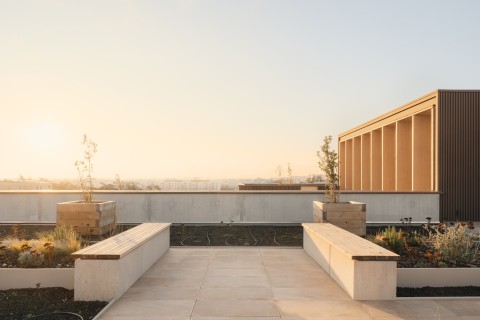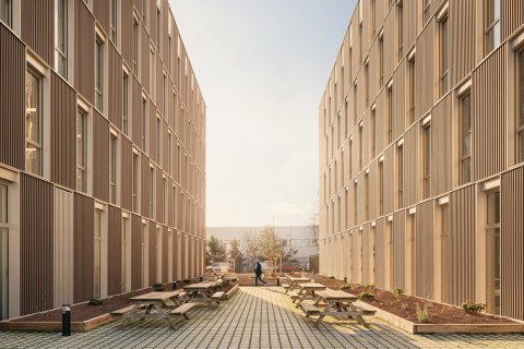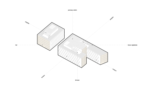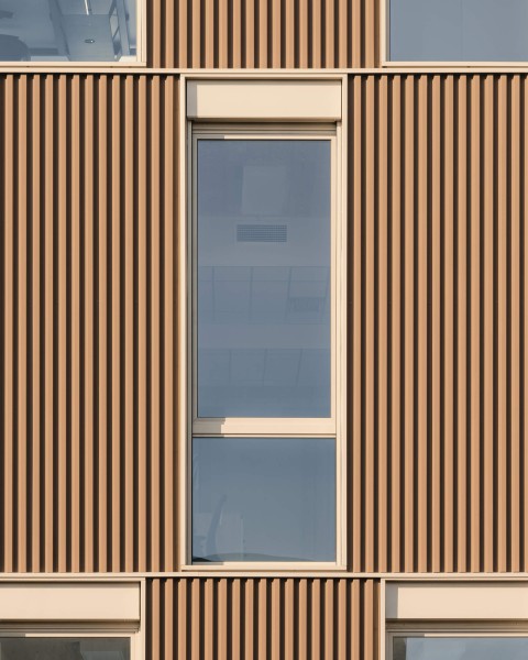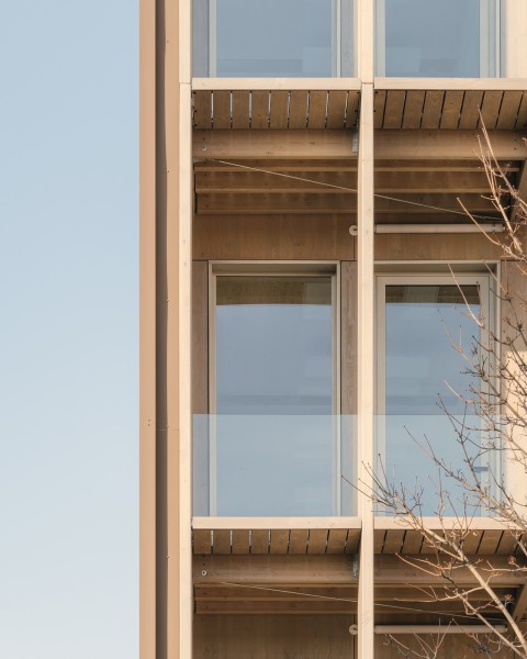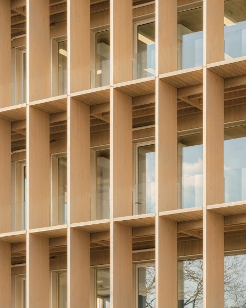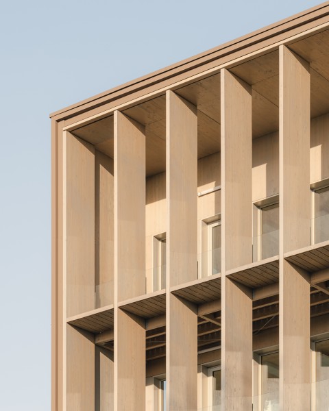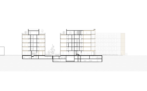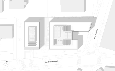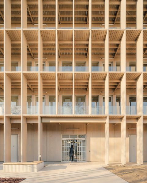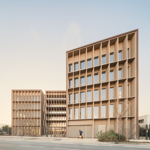 Le projet bénéficie d’une position urbaine remarquable, à la fois pierre d’angle et figure de proue du nouveau quartier. Deux figures distinctes dont les longueurs variables et les pignons entièrement vitrés définissent la signature architecturale du projet. Les façades frontales engagent un dialogue avec le secteur de l’Autre Soie en révélant les espaces et la matière intérieure principale des bâtiments : le bois. L’utilisation du bois est une volonté militante et maitrisée ; toute l’architecture du bâtiment est dictée par ce matériau. Projet conçu sur le modèle de Pulse, projet BFV Architectes à Saint Denis.