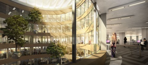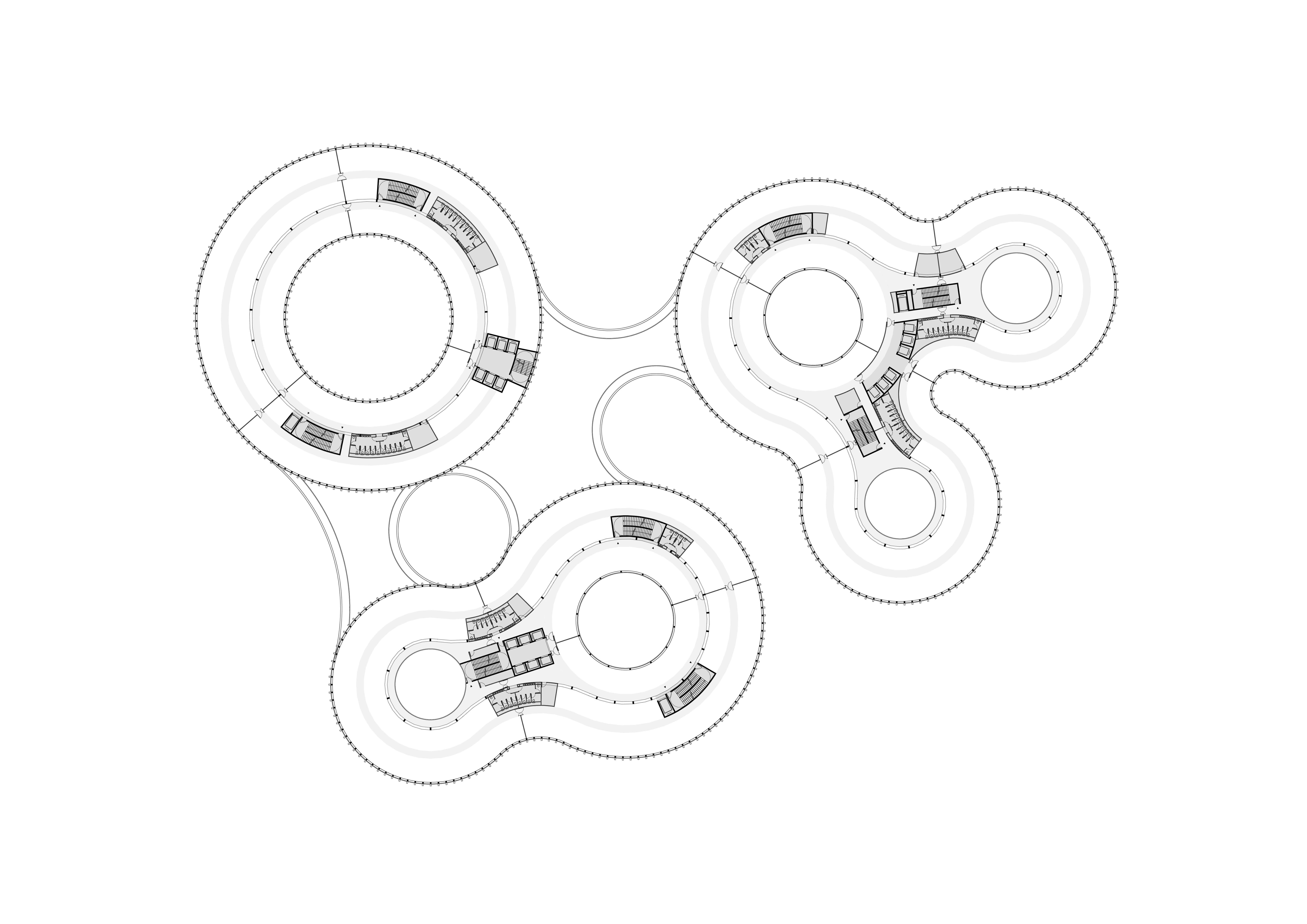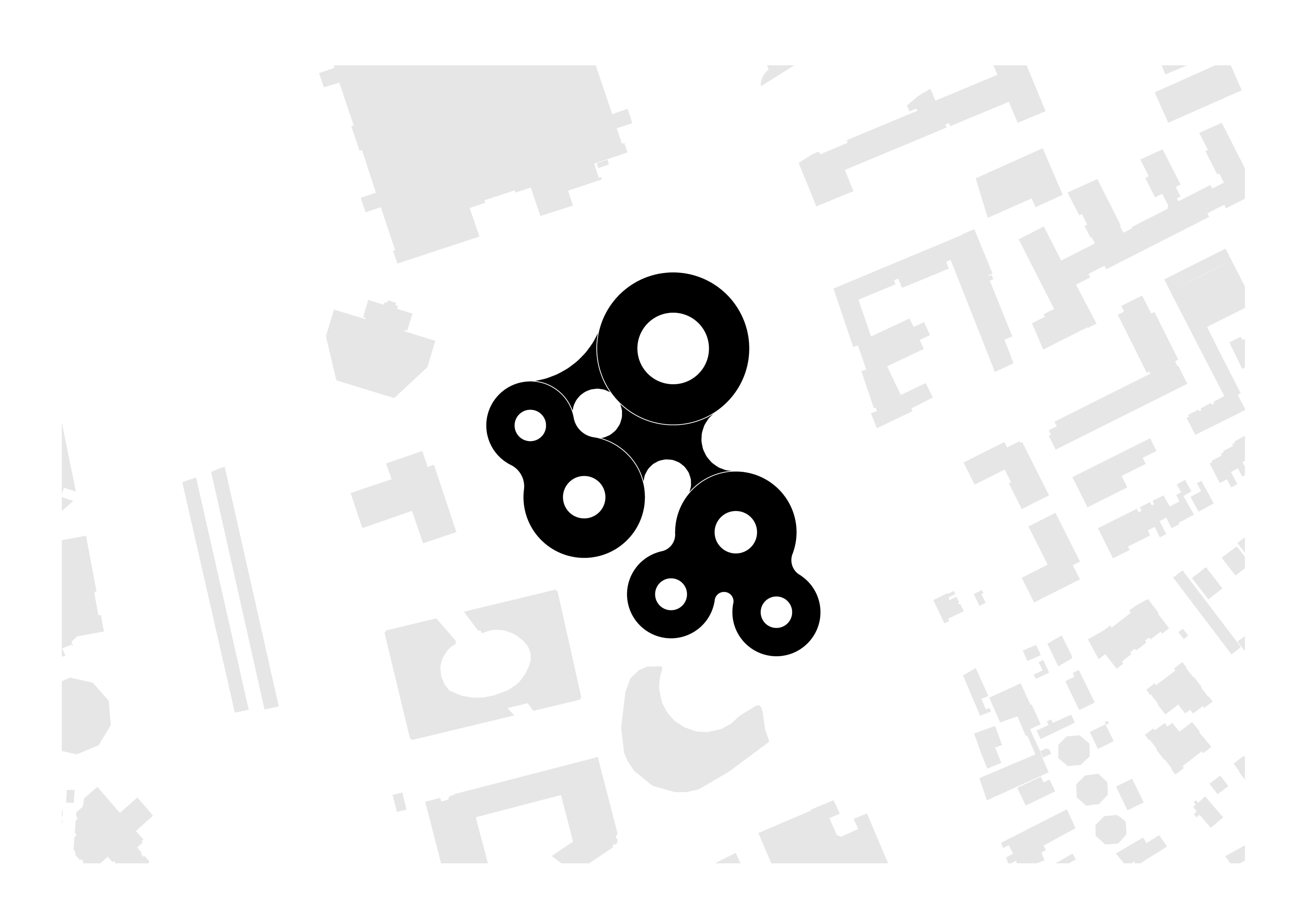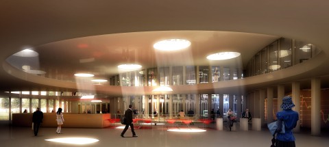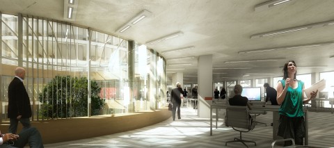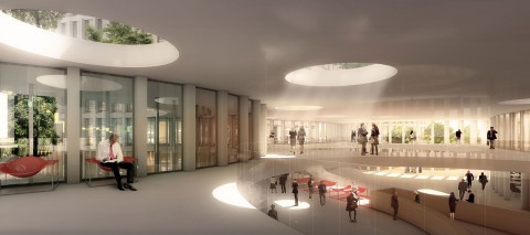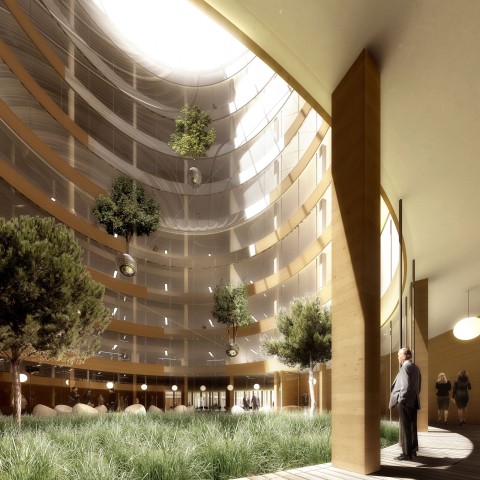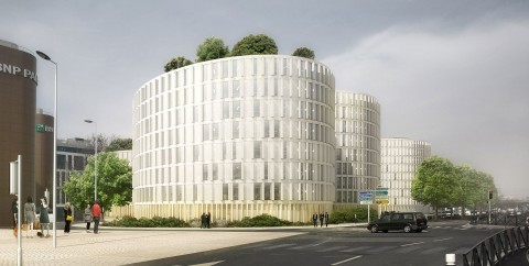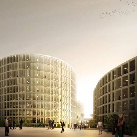 La forme de l’édifice proposé est en rupture avec la culture géométrique architecturale et structurelle courante pour des programmes de bâtiments tertiaires. Cette forme, résultant d’un processus de fragmentation fluide, offre de réelles percées visuelles et réduit les vis-à-vis entre les bâtiments eux-mêmes et avec le contexte urbain. La composition tripartite définit un centre, véritable point de repère où se trouvent l’entrée et l’accueil. Le bâtiment propose une diversité de lieux de convivialité contrastés et complémentaires. Pas de cul-de-sac, ni de linéaires trop développés. L’open space courbe permet de limiter l’espace perçu sans rompre la continuité.