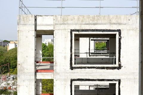 Le parti est d’opérer une transformation incluant une démolition à minima et des extensions pour donner au bâtiment une physionomie domestique plus conforme à une opération de logement. Nous simplifions la figure du bâtiment, travaillons la façade en épaisseur pour la rendre plus propice à l'installation de logements en faisant la part belle aux espaces extérieurs et permettons des usages en façade. Le rez-de-chaussée en partie nord, constitue un socle actif intégrant des commerces et les halls des résidences de co-living. Le projet prévoit des extensions en hauteur (un niveau supplémentaire + un attique partiel) et en épaisseur (extension en façade Sud des barrettes) avec un système constructif léger (structure bois).