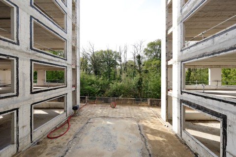Nous intégrons également une dimension importante de réemploi de matériaux issus directement de la construction existante. Nous déposons l’intégralité des vêtures de façades actuelles (pierre agrafée, éléments menuisés et Alucobond) afin de les remployer pour les vêtures du bâtiment transformé. La vêture des intermédiaires est en pierre agrafée réemployée.
