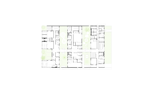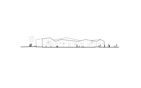 Nous intercalons des pavillons formés de bandes perpendiculaires à la voie principale d’accès (orientation est-ouest) avec des jardins et patios en bande, abritant les différentes entités de programme.