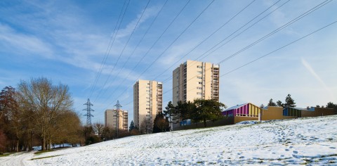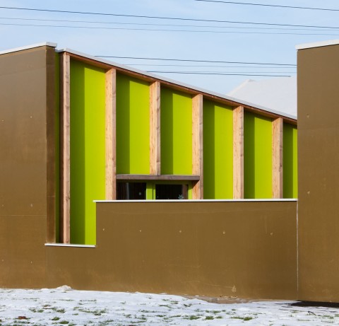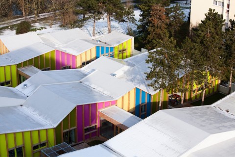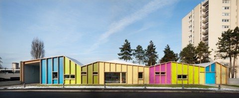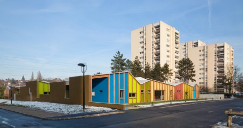 Une cité résidentielle typique des années 70 faite de tours et de barres judicieusement réparties et définissant des espaces libres et collectifs joliment paysagés. Le projet se présente comme une composition en contraste total avec son environnement immédiat constitué d’immeubles hauts ou longs réalisés en béton : le projet se développe sur un seul niveau en rez-de-chaussée, réalisé intégralement en structure bois : murs en ossature bois + charpente. Les bandes s’additionnent pour former un paysage unique et insolite.