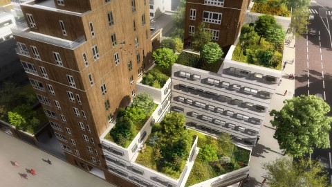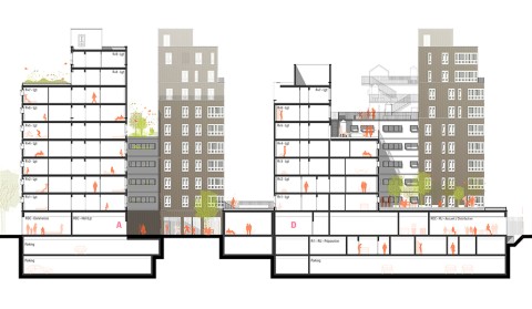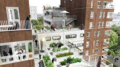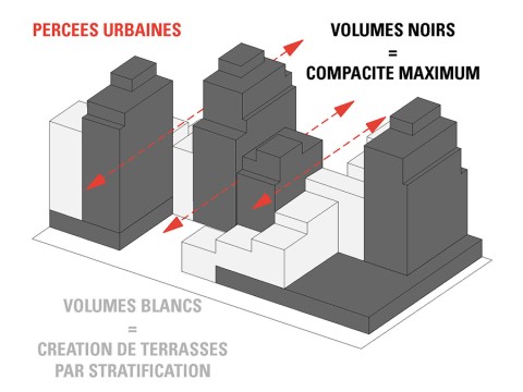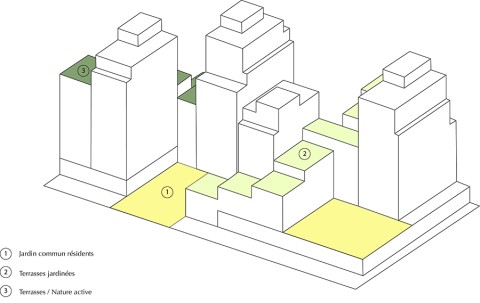 Le projet développe une solution mixte en écrêtant les volumes au fur et à mesure de leur développement vertical. Ceci a pour conséquence de libérer un maximum de surfaces de terrasses, de dessiner des volumes très fragmentés et de constituer une skyline très aérée. Les terrasses deviennent le support de nouveaux usages : les terrasses paysagées supports de biodiversité, les terrasses communes supports de démarches participatives et citoyennes.