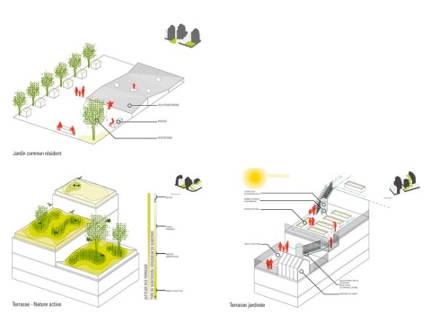 les Terrasses « Nature Active », concept de présence paysagère autonome en milieu urbain. Sorte de biotope assurant une bio diversité.