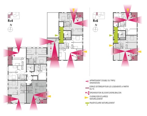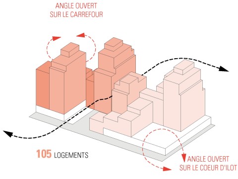 Deux immeuble-ilots associant chacun deux plots distribuent 105 logements. Chacun de ces immeubles permet ainsi de desservir 8 logements à partir de deux cages, sur un niveau courant « plein ». En effet, nous allégeons le dispositif au fur et à mesure de la progression vers les étages supérieurs, en supprimant des appartements.