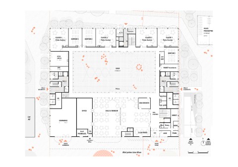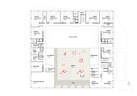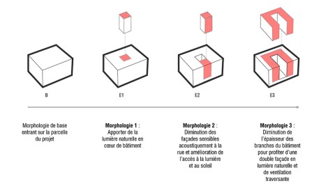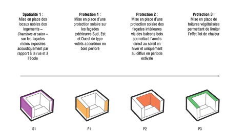 Afin de résoudre concomitamment les deux problématiques de l’école située en rdc (bruit + chute d’objets dans la cour), nous proposons d’orienter toutes les pièces de vie des logements vers l’extérieur de la parcelle, et donc de mettre le maximum de distance entre les pièces de vie des résidents et les cours d’école qui se trouvent au centre de la figure.