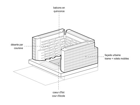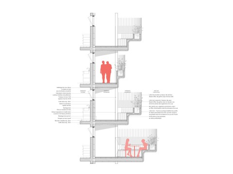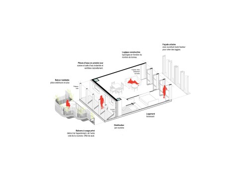 Usage : Superposition de deux programmes. 100% des logements desservis par coursives sont traversants et possèdent une « pièce » extérieure sous forme de balcon.
