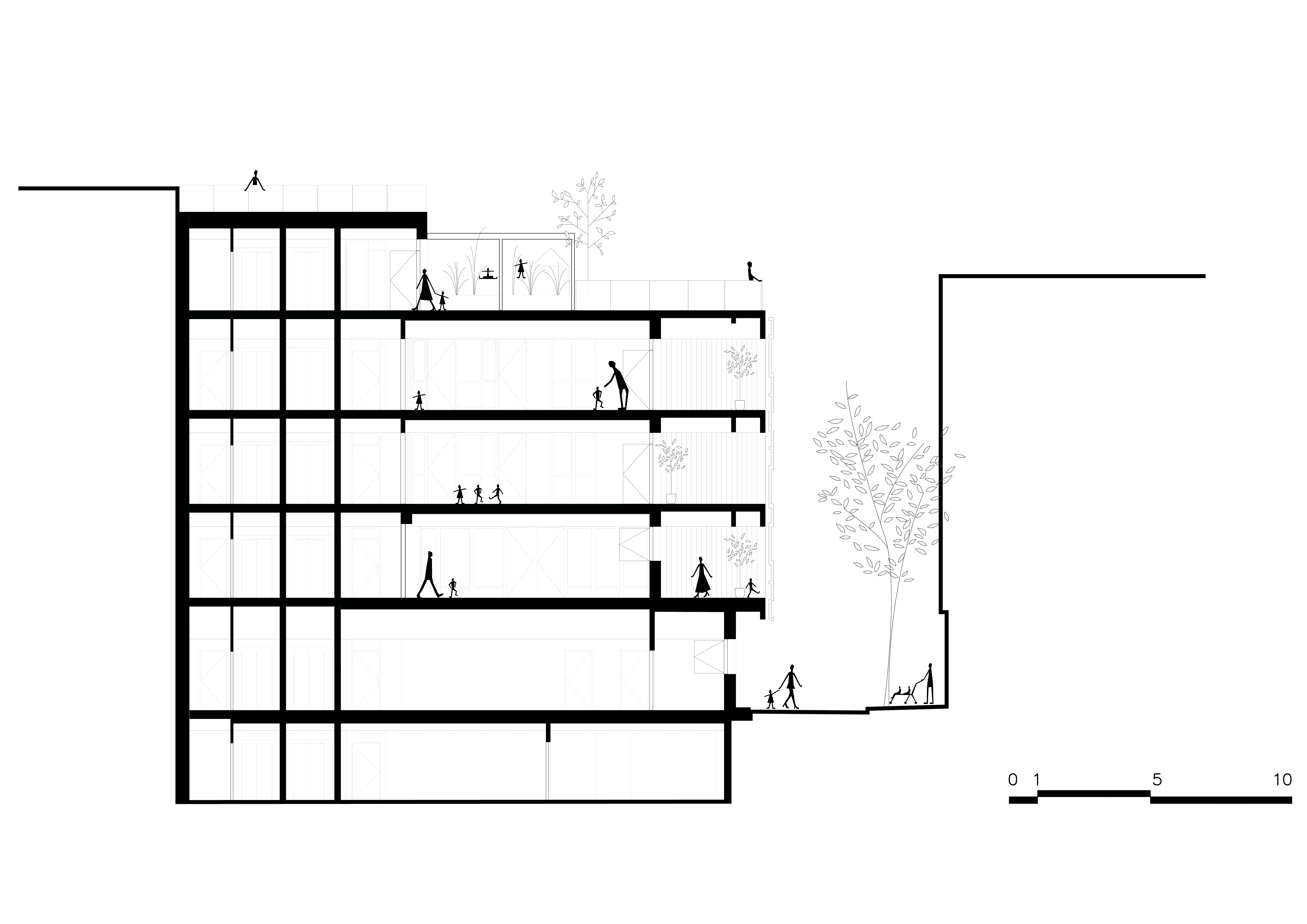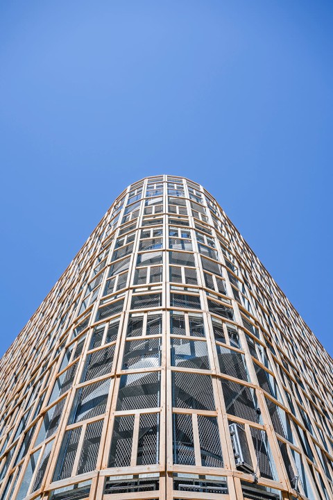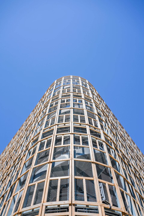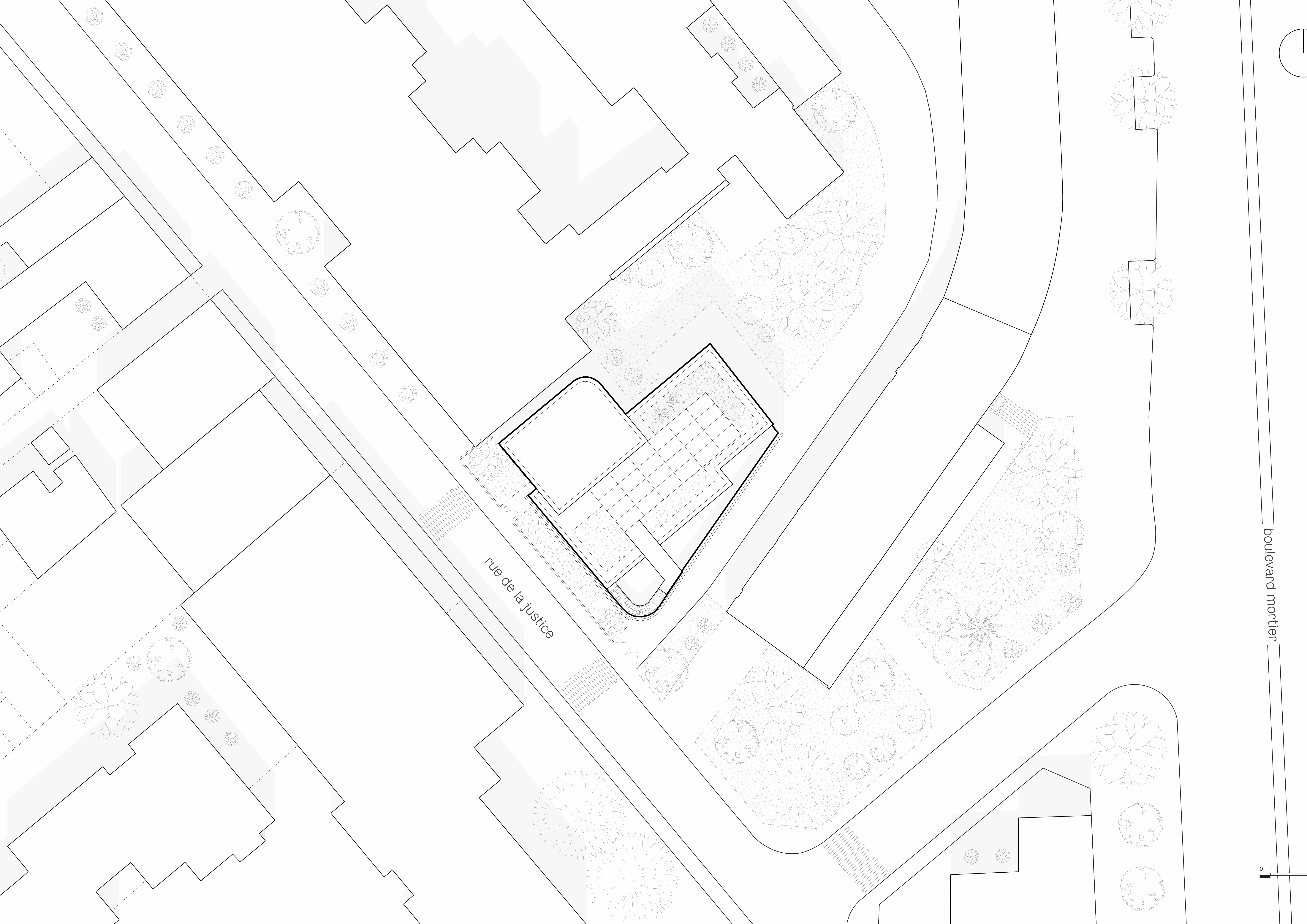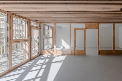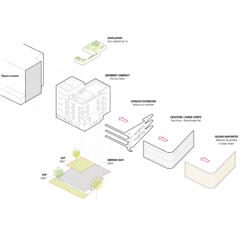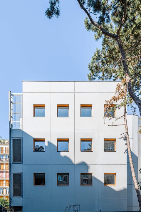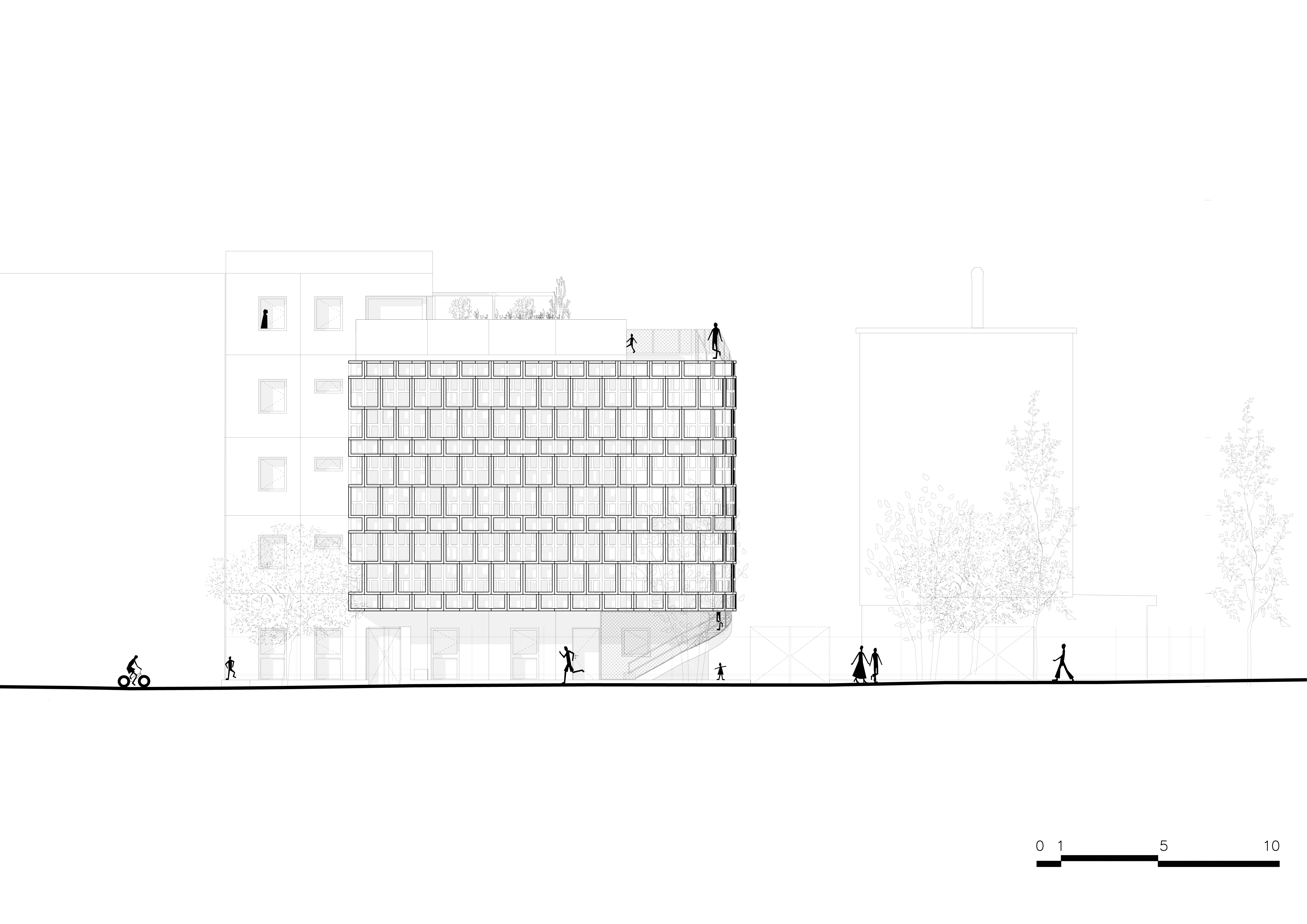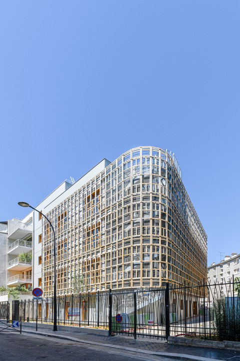 Crèche multi accueil et familiale, la crèche Justice est une construction de 5 niveaux qui se superposent simplement pour intégrer le programme des salles dédiées aux enfants. A chaque niveau, un large balcon, orienté plein Sud, offre aux enfants un espace de jeu extérieur de plein pied avec leurs salles d’activités. Une résille, constituée de traverses en chêne massif issu du réemploi, forme une façade poreuse, à la fois ouverte sur son environnement et protectrice des rayons directs du soleil et des vues depuis l’espace public. Dans sa physionomie, la nature de sa façade et sa toiture plantée, le bâtiment constitue un élément paysager en lui-même : il est davantage un équipement dans un jardin qu’un équipement sur rue.