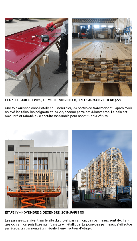 Réemploi : Recyclage des traverses de chêne issues de 640 portes palières récupérées sur un chantier à proximité.