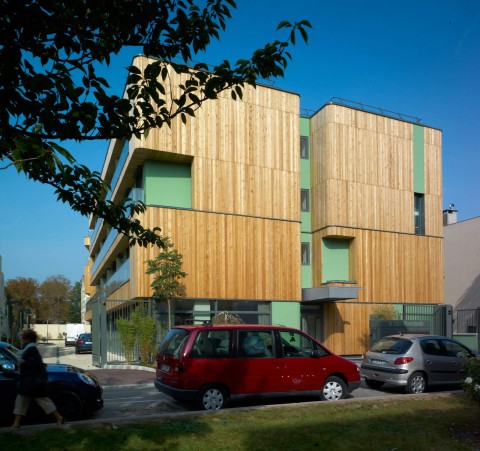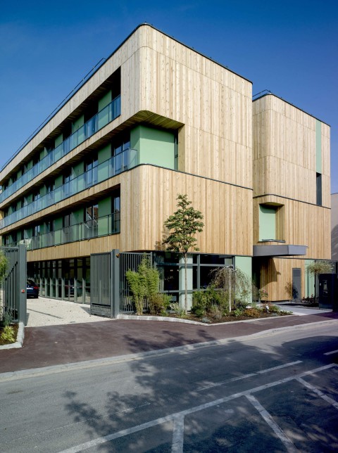 Ce bâtiment est conçu pour des personnes âgées, fortement dépendantes ; la configuration et le caractère des différents espaces sont conçus pour favoriser l’appropriation, l’orientation et la facilité de circulation des résidents, l’agrément des visiteurs ainsi que l’efficacité quotidienne pour le personnel. Le bâtiment prend l’image d’un meuble sophistiqué où chaque pièce est pensée pour son ergonomie et son usage. Cette proposition fonctionnelle s’accompagne d’un parti d’insertion urbaine affirmé : deux corps de bâtiment s’articulent pour créer l’identité du projet. En tête de la composition, un bâtiment proue qui installe la présence urbaine du projet dans un langage volumétrique « parisien ». Coté parc, une forme fluide qui s’efface dans la profondeur du végétal dans une organisation panoramique et solaire.