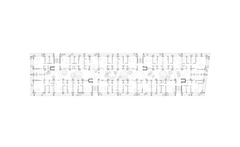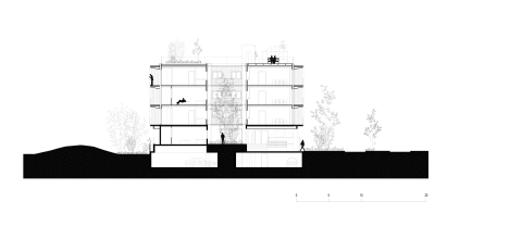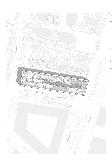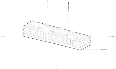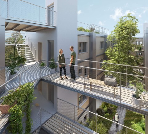 Un long espace central fait office de pièce extérieure commune. Cette « pièce » permet la distribution des appartements à travers un espace paysagé par des passerelles croisées et offre un cœur aéré, ventilé, rafraîchi et baigné de lumière naturelle. Cette distribution par l’extérieur favorisera le croisement et la rencontre des résidents en évitant la difficulté du vis-à-vis que présentent les coursives. Le toit, rendu accessible permet l’installation de lieux partagés autour de 4 terrasses accessibles munies de serres et de bacs plantés, associées aux résidents des appartements partageant une même cage d’escalier.