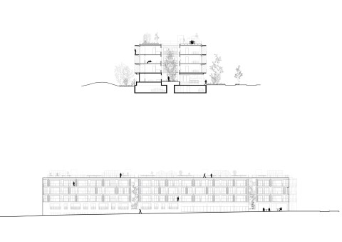Usage : Logements traversants desservis par des passerelles. 100% des logements possèdent une « pièce » extérieure sous forme de loggia ou de terrasse. Gaines à l’extérieur de l’enveloppe pour une très grande mutabilité de l’agencement intérieur. Patio central comme puit de fraicheur.