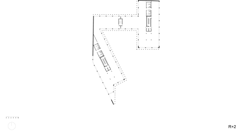 Côté ville une vêture de brique chaleureuse, tramée impeccablement, s’abaisse pour annoncer la traversée ouverte du jardin central d’une rue à l’autre.