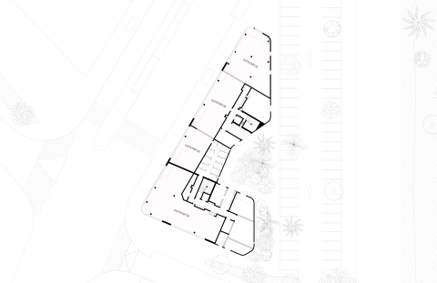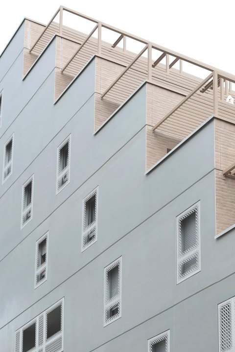 Isolé par rapport à l’organisation tramée de la ZAC des Provinces Françaises, le lot A1 se trouve dans une situation urbaine très singulière. Il est à considérer comme une « île triangulaire » dont chacune de ses trois faces répond et dialogue de manière appropriée avec ses vis-à-vis. Figure de proue verticale avec une pointe qui culmine à R+6, ce projet constitue un point de repère important sur le site. Le chanfrein arrondi des angles accentue l’effet cinétique de cette forme affinée et permet le glissement vers le boulevard ou l’intérieur de l’îlot. Chacun des 43 appartements dispose d’un grand espace extérieur : des loggias ou des terrasses équipées de pergolas.