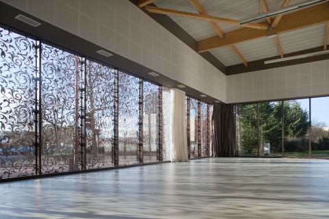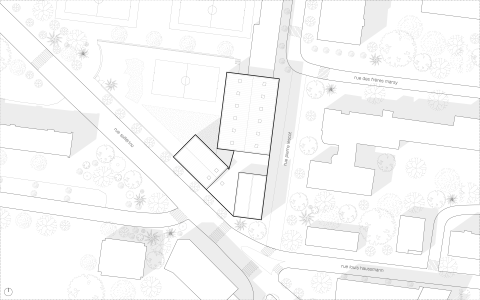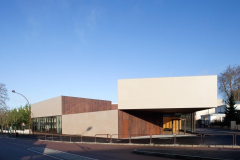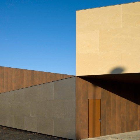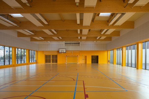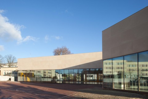 Équilibre des masses, justesse de l’implantation, noblesse des matériaux et respect du contexte. Les volumes principaux jouent des géométries particulières et constitutives du lieu. Ces volumes, aux hauteurs équivalentes sont au nombre de trois : gymnase, salle polyvalente et hall. Tous trois s’implantent naturellement sur les limites des tracés urbains. Cette fragmentation donne un sens au complexe et organise l’expérience spatiale du programme au vu des séparations fonctionnelles désirées. Ainsi, les deux salles et leurs vestiaires sont clairement séparés. La partie basse de l’équipement regroupe quant à elle toutes les fonctions annexes. L’aire sportive extérieure se retourne pour dégager un important espace vert au contact de la salle polyvalente et de sa terrasse. Les grands aplats de pierre sur rue changent de nature en retour sur certains angles pour faire place à des aplats de métal « bronze » qui s’accordent à la serrurerie.
