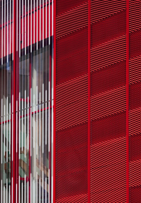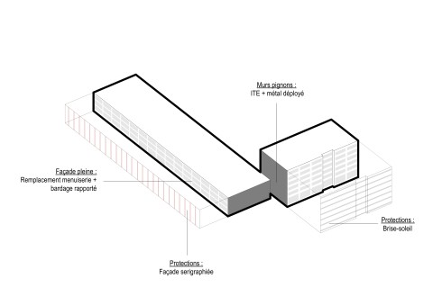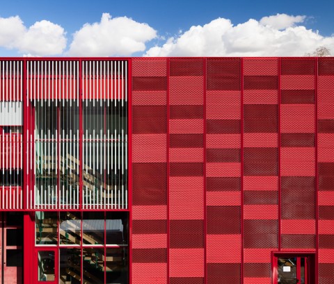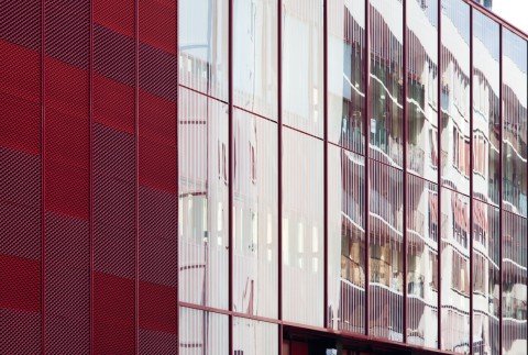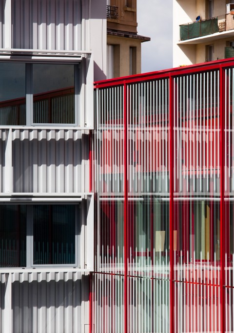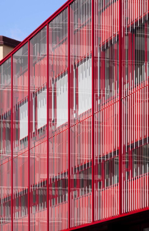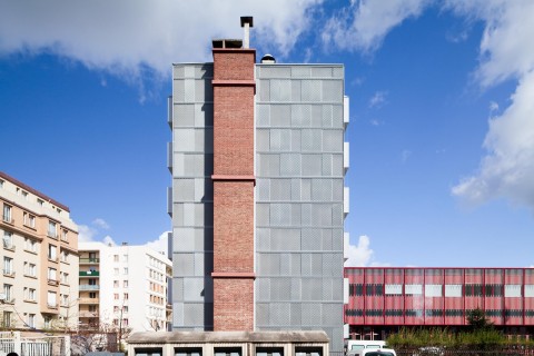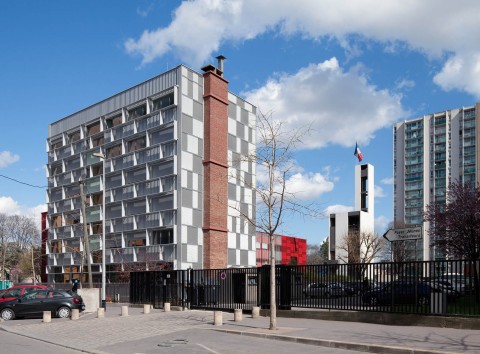 Le Centre de Secours d’Aubervilliers, bâti dans les années soixante-dix, se présente comme un bâtiment classique de cette époque. Une volumétrie intéressante avec une distinction nette d’un élément horizontal dédié à l’activité du centre (remise, chambres de garde et administration) et d’un élément vertical dédié aux logements. Outre l’amélioration du confort et de l’isolation thermique des bâtiments, la restructuration a permis de conforter cette différence en attribuant à chacun des deux volumes un matériau et une couleur pour le traitement des façades : verre sérigraphié et couleur rouge pour la remise, tôle aluminium en métal déployé et couleur grise pour les logements.