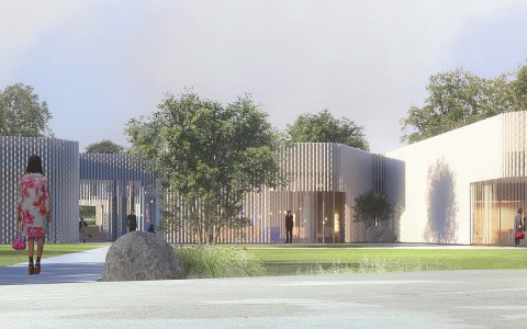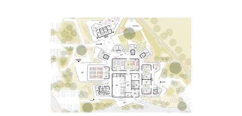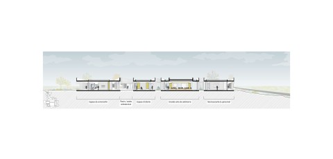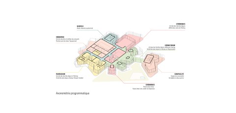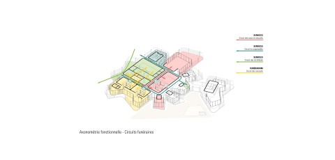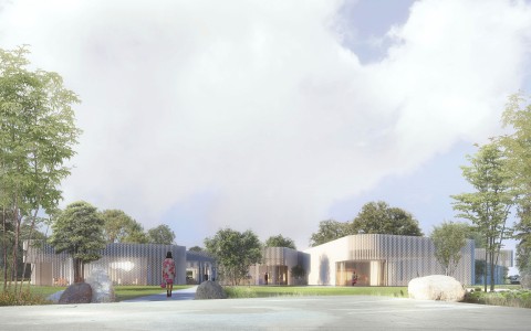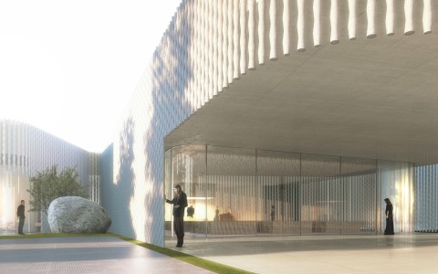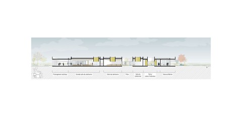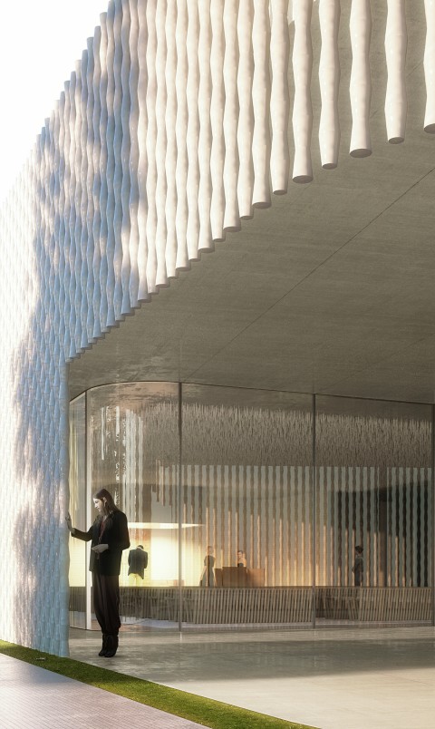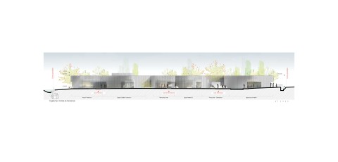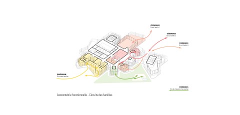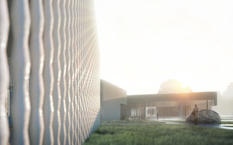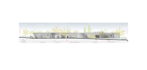 Bâtiment sans façade principale, notre projet s’organise autour d’un point central dont rayonnent les espaces destinés au public. Il se présente comme une succession de seuils matérialisés par une peau périmétrique assurant une transition progressive du massif vers le transparent, du rugueux vers le doux, du matériel vers l’immatériel. Seuils que les visiteurs franchissent successivement pour accéder aux espaces de rencontre avec le défunt. Le plan s’organise alors comme une fleur dont le cœur serait les espaces dédiés au défunt et les pétales les espaces dédiés au public. Le projet se matérialise ainsi par une bande constante, fluide et sans émergence, qui forme des plis et des replis au sein d’une large épaisseur végétale.