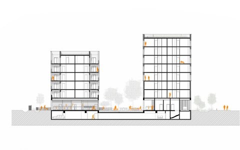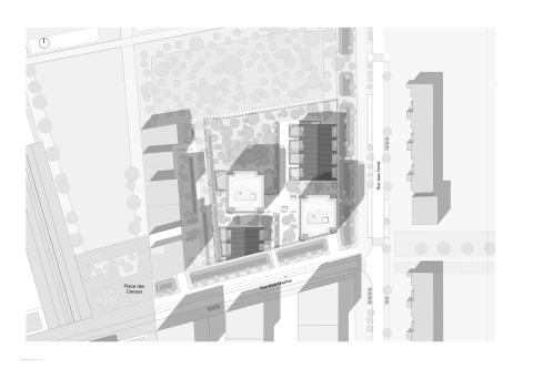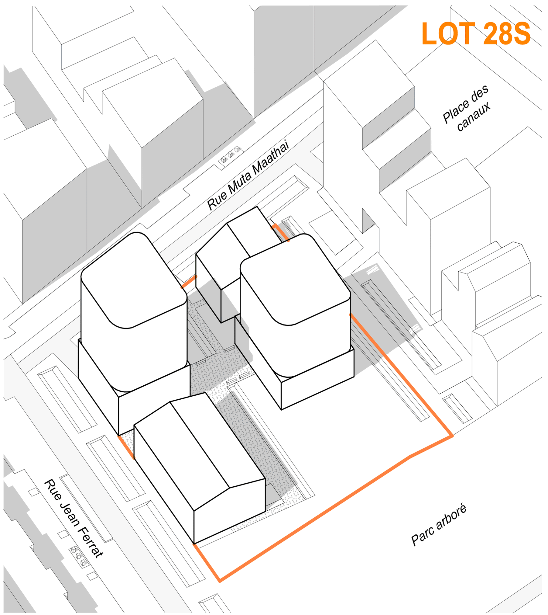 Notre proposition s’articule sur une réinterprétation de deux lignes en deux fois deux plots alignés, de nature et de physionomie différentes, dont l’architecture évoque l’imaginaire lié à l’histoire maraichère du site :