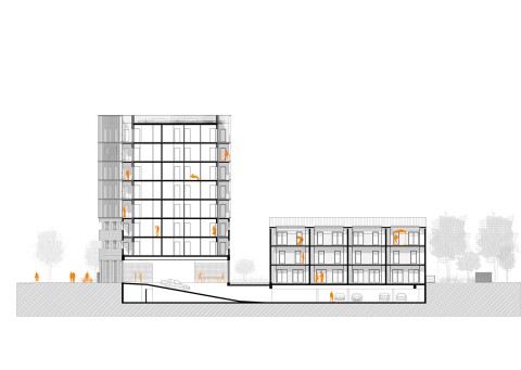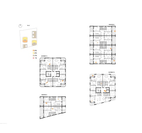Nous proposons un alignement respectivement sur les deux « lignes » du lot d’un plot vertical et d’un plot horizontal. Cette disposition en quinconce a le mérite de permettre à la fois le désir de vues dégagées pour les plots verticaux sans vis-à-vis et l’identification des typologies entre appartements en collectifs et maisons de villes jumelées et superposées.