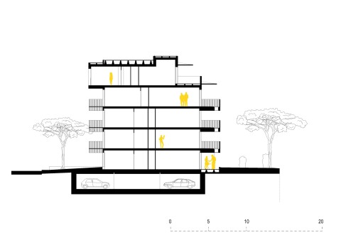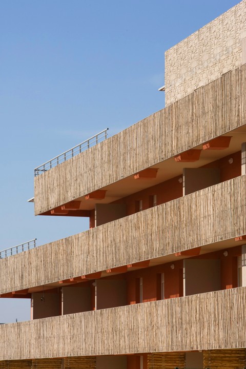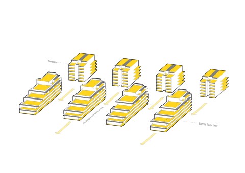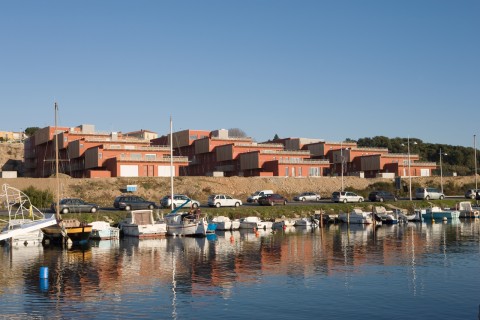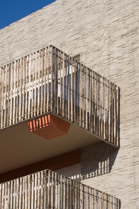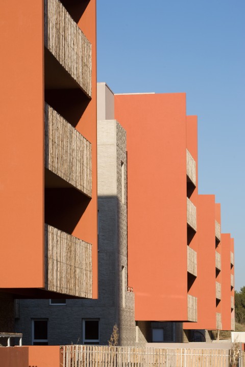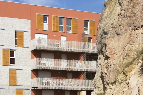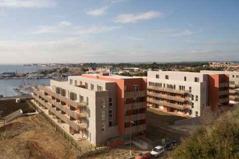 Site exceptionnel et lieu d’une mémoire ouvrière, l’ancienne carrière des « Bas fourneaux » est pour la ville de Balaruc-les-Bains un véritable enjeu dans la recherche d’une cohérence urbaine et d’une unité paysagère. La volumétrie reste simple et sobre. Les bâtiments sont disposés perpendiculairement à la route de Sète et dégagent des vues sur la falaise environnante. Ils se développent en étages décroissants et retracent virtuellement le gabarit topographique de la carrière. En corrélation avec le parti de paysage, la végétalisation des terrasses au moyen de jardinières plantées contribue à donner au projet un caractère spécifique.