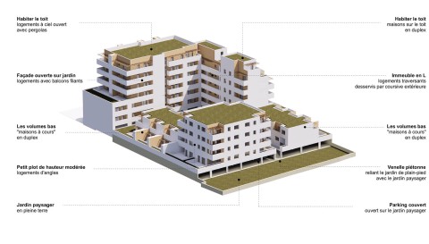 La première qualité architecturale du projet réside dans sa volumétrie ; fruit du travail souhaité par les urbanistes sur des typologies et des modes d’habiter variés, ce qui a pour conséquence d’offrir une volumétrie complexe, faite de découpage en plan, d’épannelage en toiture, d’échelles différentes. Nous proposons en contrepartie un traitement architectural sobre et cohérent afin de favoriser ce caractère volumétrique.