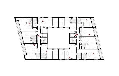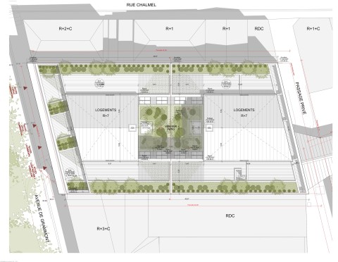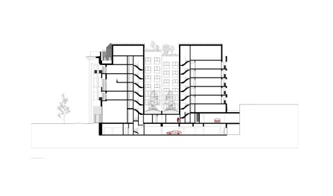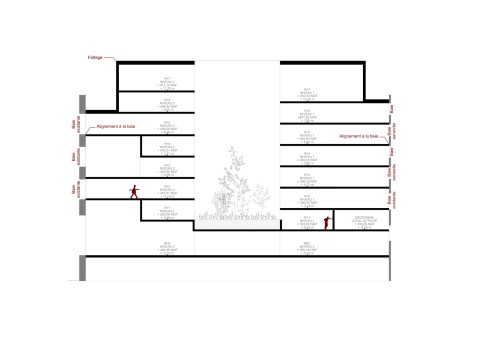 La transformation du bâtiment réside essentiellement dans la création d’un patio au centre du volume afin de permettre l’éclairement naturel des pièces à vivre des appartements. Le patio est installé à partir du R+1 ; de 80 cm à 120cm de terre sous la forme de talus viendront lui apporter une dimension paysagère. Certains logements en raison de la distribution en demi-niveaux du parking bénéficient de très belles hauteurs et de prises de vues et de lumière sur rue et sur patio.