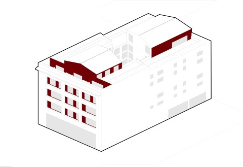 Sur la façade principale, ainsi que sur la façade arrière, des loggias seront aménagées pour la création d’une nouvelle façade installée en retrait d’1 m du nu existant. Celles-ci permettront de recomposer des vues adaptées aux niveaux nouvellement créés ; ainsi que d’offrir aux résidents des espaces extérieurs d’agrément. Ces nouvelles façades seront traitées avec un revêtement bois visible depuis l’extérieur.